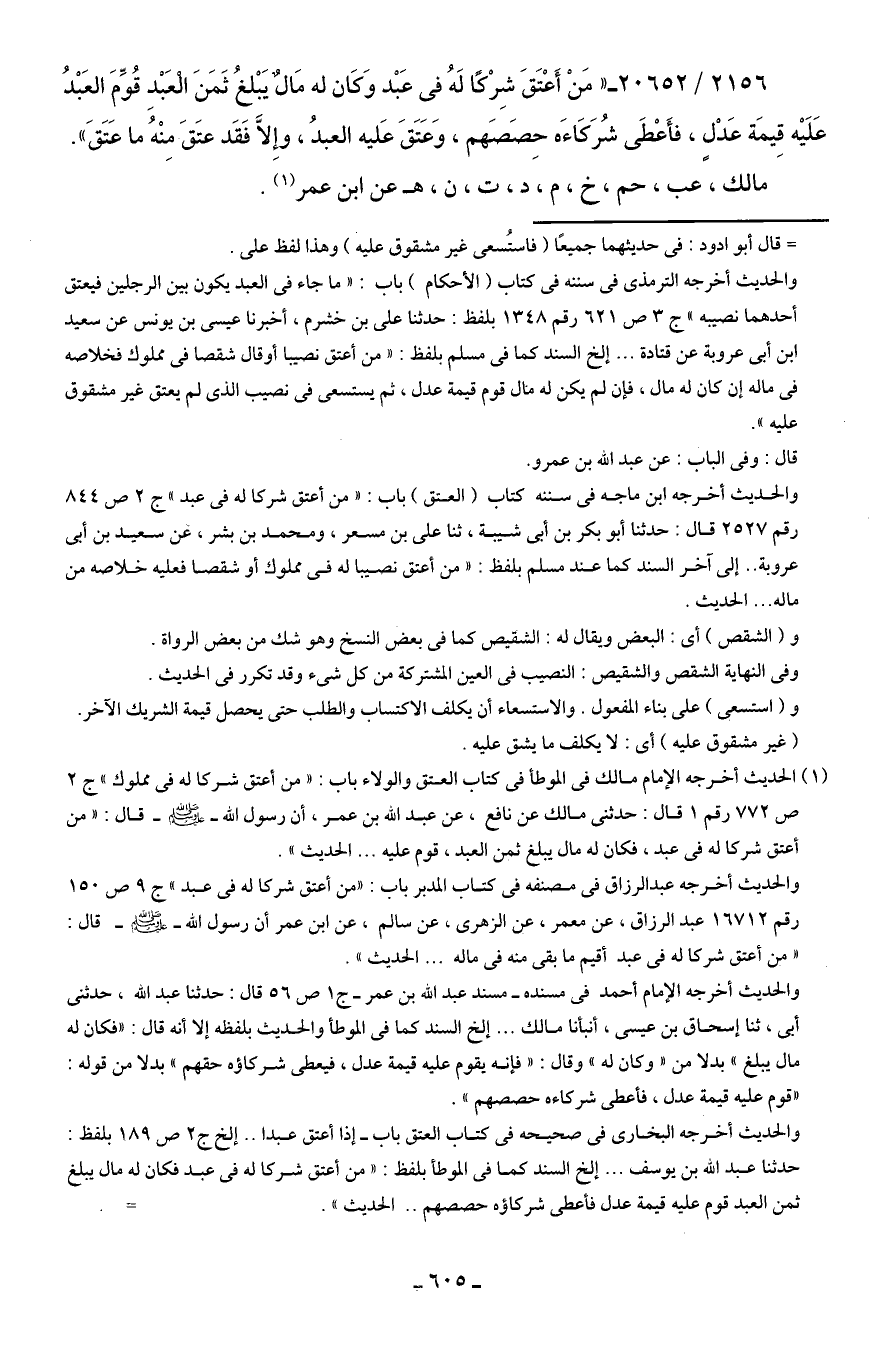 (¬1) الحديث أخرجه الإمام مالك في الموطأ في كتاب العتق والولاء باب: "من أعتق شركا له في مملوك "ج 2 ص 772 رقم 1 قال: حدثني مالك عن نافع، عن عبد الله بن عمر، أن رسول الله - صلى الله عليه وسلم - قال: "من أعتق شركا له في عبد، فكان له مال يبلغ ثمن العبد، قوم عليه ... الحديث".