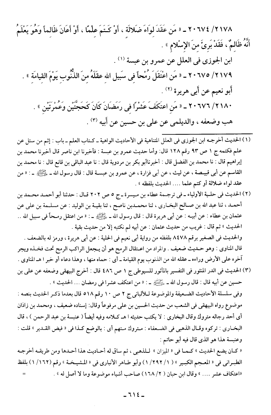 2180/ 20676 - "مَنِ اعتَكَفَ عَشْرًا فِي رَمَضَانَ كَانَ كَحَجَّتَين وَعُمْرَتَينِ".
