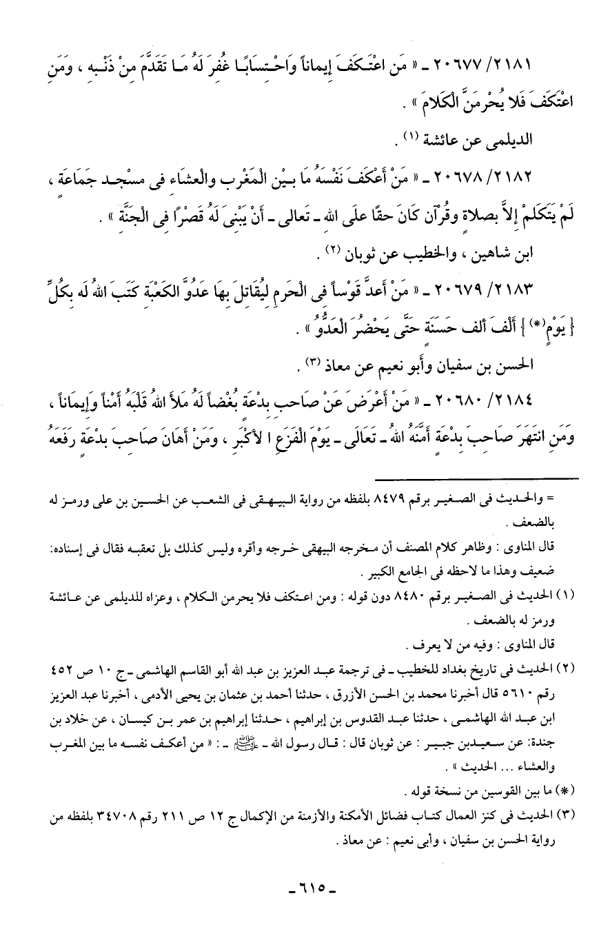 2181/ 20677 - "مَن اعْتَكَفَ إِيمانًا وَاحْتِسَابًا غُفِرَ لَهُ مَا تَقَدَّمَ مِنْ ذَنْبهِ، وَمَنِ اعْتَكَفَ فَلا يُحْرمَنَّ الْكَلامَ".