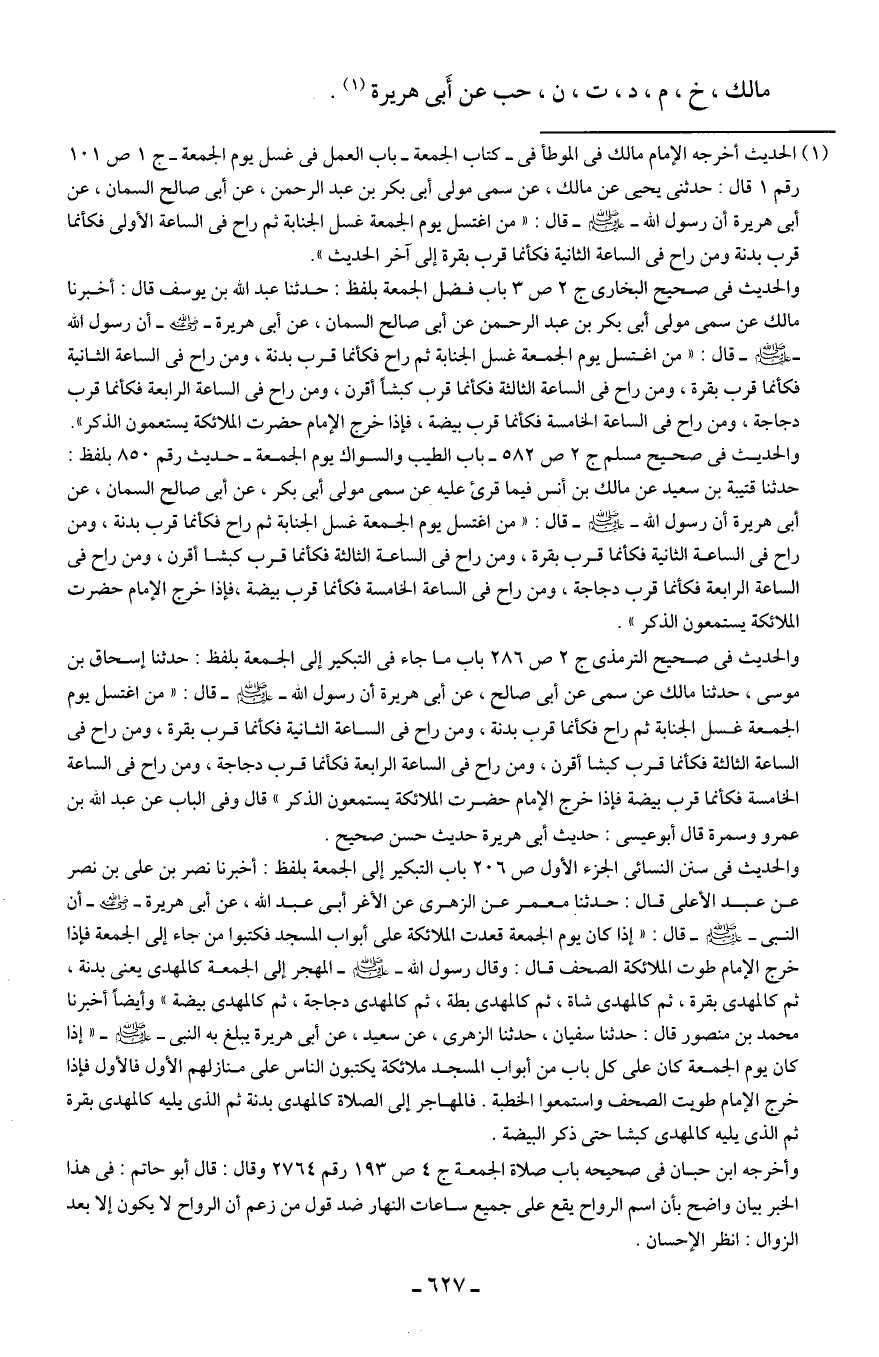 (¬1) الحديث أخرجه الإمام مالك في الموطأ في - كتاب الجمعة - باب العمل في غسل يوم الجمعة - ج 1 ص 101 رقم 1 قال: حدثني يحيى عن مالك، عن سمى مولى أبي بكر بن عبد الرحمن، عن أبي صالح السمان، عن أبي هريرة أن رسول الله - صلى الله عليه وسلم - قال: "من اغتسل يوم الجمعة غسل الجنابة ثم راح في الساعة الأولى فكأنما قرب بدنة ومن راح في الساعة الثانية فكأنما قرب بقرة إلى آخر الحديث".
