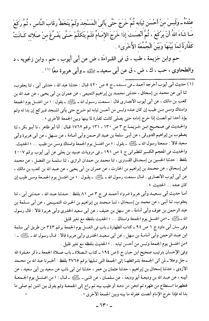 (¬1) حديث أبي أيوب أخرجه أحمد - في مسنده - ج 5 ص 420 قال: حدثنا عبد الله، حدثني أبي، ثنا يعقوب، ثنا أبي عن محمد بن إسحاق، حدثني محمد بن إبراهيم التميمى، عن عمران بن أبي يحيى، عن عبد الله بن كعب بن مالك، عن أبي أيوب الأنصاري قال: سمعت رسول الله - صلى الله عليه وسلم - يقول: "من اغتسل يوم الجمعة واستاك ومر من طيب إن كان عنده ولبس من أحسن ثيابه تم خرج حتى يأتي المسجد فيركع إن بدا له ولم يؤذ أحدا ثم أنصت إذا خرج إمامه حتى يصلى كانت كفارة لما بينها وبين الجمعة الأخرى".