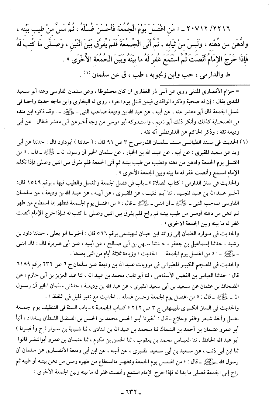 2216/ 20712 - "مَنِ اغْتَسَلَ يَوْمَ الْجُمُعَةِ فَأَحْسَنَ غُسْلَهُ، ثُمَّ مَسَّ مِنْ طِيبِ بَيتِه، وادَّهَن من دُهْنِهِ، وَلَبِسَ مِنْ ثِيَابِهِ، ثُمَّ أَتَى الْجُمُعَةَ فَلَمْ يُفرِّق بَينَ اثْنَينِ، وَصَلَّى مَا كْتِبَ لَهُ فَإِذَا خَرَجَ الإِمَامُ أَنْصَتَ ثُمَّ اسْتَمَعَ غُفِرَ لَهُ ما بِينَهُ وَبَينَ الْجُمُعَةِ الأُخْرَى".