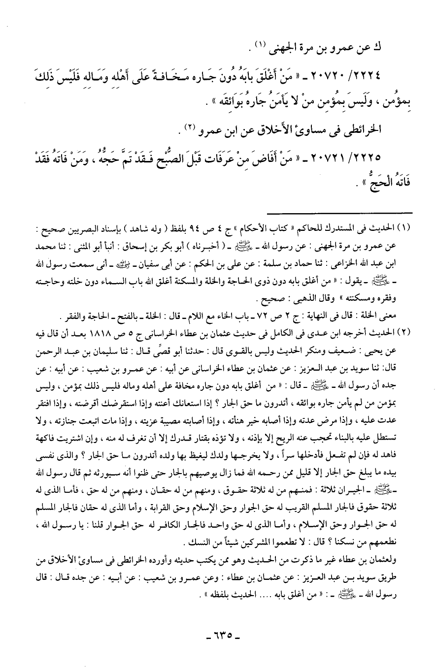 (¬2) الحديث أخرجه ابن عدي في الكامل في حديث عثمان بن عطاء الخراساني ج 5 ص 1818 بعد أن قال فيه عن يحيى: ضعيف ومنكر الحديث وليس بالقوى قال: حدثنا أبو قصِّي قال: ثنا سليمان بن عبد الرحمن قال: ثنا سويد بن عبد العزيز: عن عثمان بن عطاء الخراساني عن أبيه: عن عمرو بن شعيب: عن أبيه: عن جده أن رسول الله - صلى الله عليه وسلم - قال: "من أغلق بابه دون جاره مخافة على أهله وماله فليس ذلك بمؤمن، وليس بمؤمن من لم يأمن جاره بوائقه، أتدرون ما حق الجار؟ إذا استعانك أعنته وإذا استقرضك أقرضته، وإذا افتقر عدت عليه، وإذا مرض عدته وإذا أصابه خير هنأته، وإذا أصابته مصيبة عزيته، وإذا مات اتبعت جنازته، ولا تستطل عليه بالبناء تحجب عنه الريح إلا بإذنه، ولا تؤذه بقتار قدرك إلا أن تغرف له منه، وإن اشتريت فاكهة فاهد له فإن لم تفعل فأدخلها سرًّا، ولا يخرجها ولدك ليغيظ بها ولده أتدرون ما حق الجار؟ والذي نفسي بيده ما يبلغ حق الجار إلا قليل ممن رحمه الله فما زال يوصيهم بالجار حتى ظنوا أنه ليورثه ثم قال رسول الله - صلى الله عليه وسلم - الجيران ثلاثة: فمنهم من له ثلاثة حقوق، ومنهم من له حقان، ومنهم من له حق، فأما الذي له ثلاثة حقوق فالجار المسلم القريب له حق الجوار وحق الإسلام وحق القرابة، وأما الذي له حقان فالجار المسلم له حق الجوار وحق الإسلام، وأما الذي له حق واحد فالجار الكافر له حق الجوار قلنا: يا رسول الله، نطعمهم من نسكنا؟ قال: لا تطعموا المشركين شيئًا من النسك.