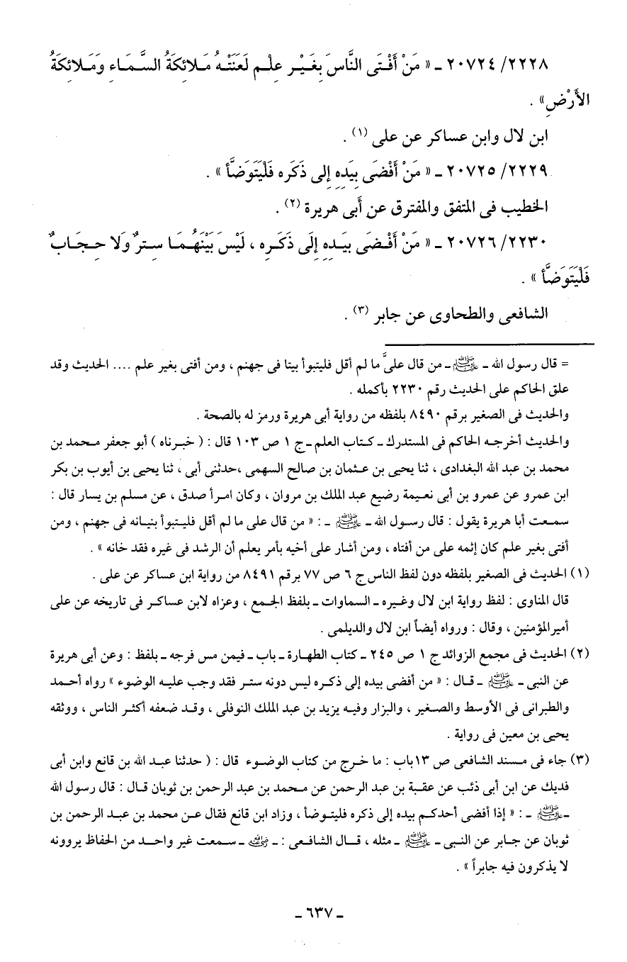 2230/ 20726 - "مَنْ أَفْضَى بيَدِهِ إِلَى ذَكَرِه، لَيسَ بَينَهُمَا سِترٌ وَلا حِجَابٌ فَليَتَوَضَّأ".