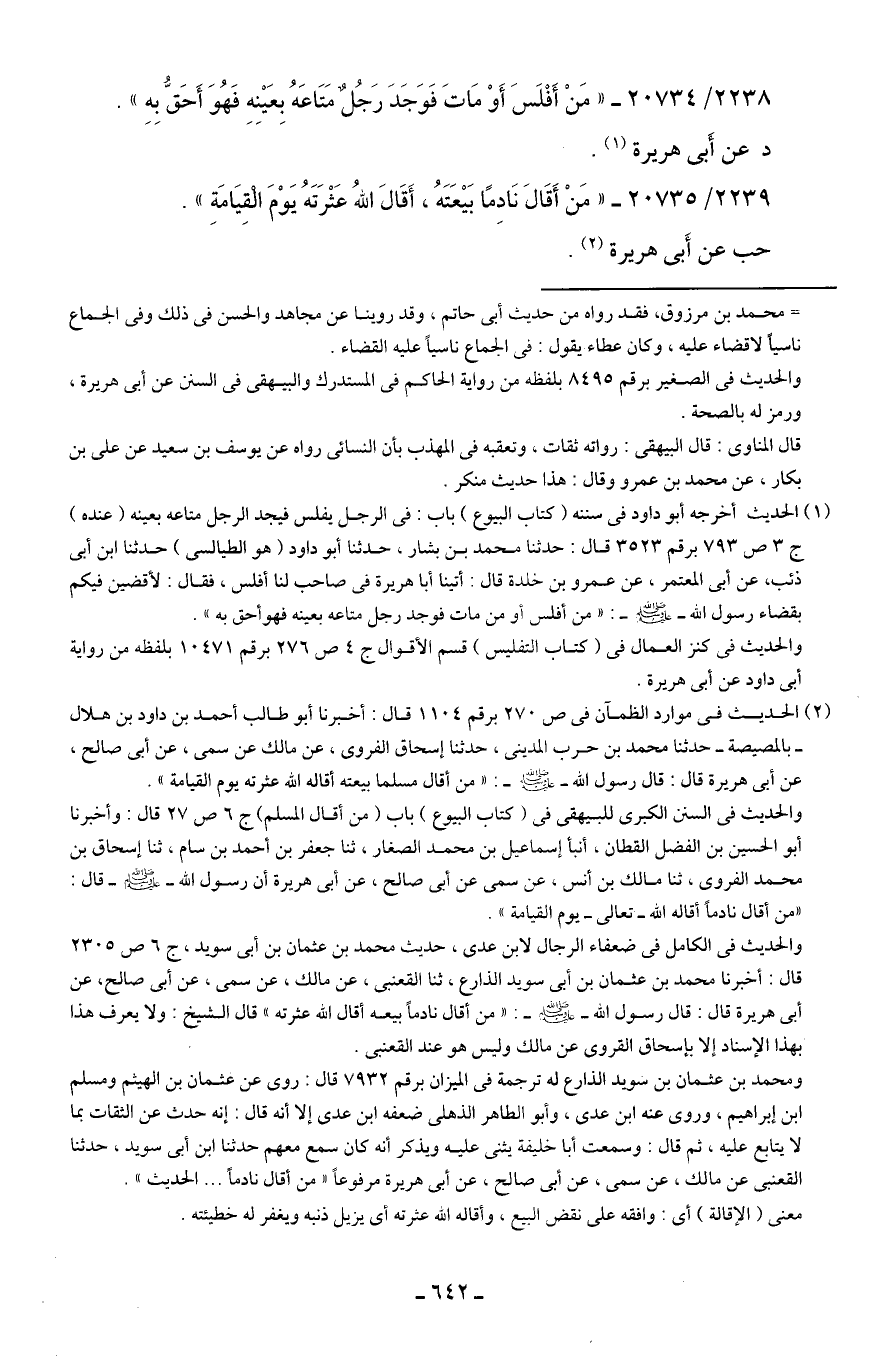2238/ 20734 - "مَنْ أَفْلَسَ أَوْ مَاتَ فَوَجَدَ رَجُلٌ مَتَاعَهُ بِعَينِهِ فَهُوَ أَحَقُّ بِهِ".
