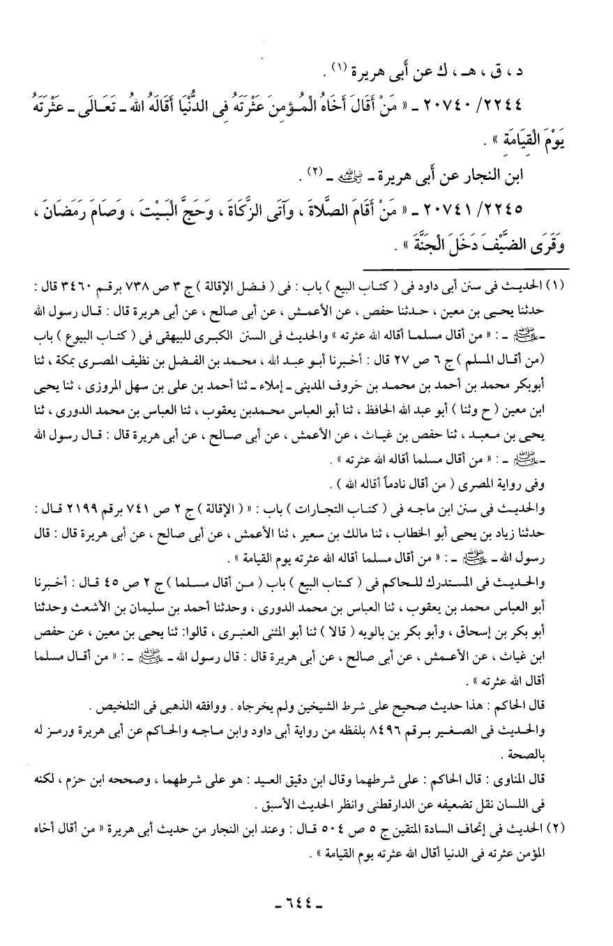 2244/ 20740 - "مَنْ أَقَال أَخَاهُ الْمُؤمِنَ عَثْرَتَهُ فِي الدُّنْيَا أَقَالهُ اللهُ -تَعَالى- عَثْرَتَهُ يَوْمَ الْقِيَامَةِ".