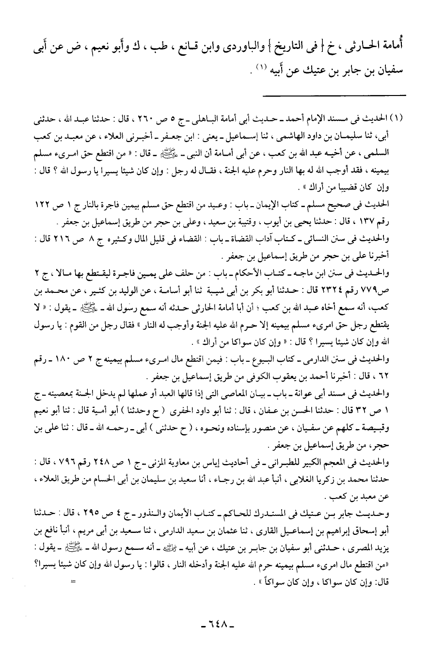 (¬1) الحديث في مسند الإمام أحمد -حديث أبي أمامة الباهلي- ج 5 ص 260، قال: حدثنا عبد الله، حدثني أبي، ثنا سليمان بن داود الهاشمى، ثنا إسماعيل -يعني: ابن جعفر- أخبرني العلاء، عن معبد بن كعب السلمى، عن أخيه عبد الله بن كعب، عن أبي أمامة أن النبي - صلى الله عليه وسلم - قال: "من اقتطع حق امرئ مسلم بيمينه، فقد أوجب الله له بها النار وحرم عليه الجنة، فقال له رجل: وإن كان شيئًا يسيرا يا رسول الله؟ قال: وإن كان قضيبا من أراك".