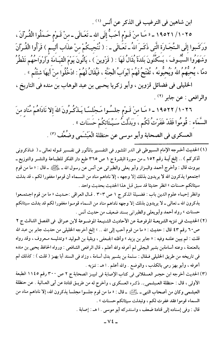 (¬3) الحديث أخرجه ابن حجر العسقلانى في كتاب الإصابة في تمييز الصحابة ج 2 ص 300 رقم 1145 الطبعة الأولى، قال: حنظلة العبشمي. ذكره العسكرى، وأخرج له من طريق قتادة عن أبي العالية. عن حنظلة العبشمى وكان من أصحاب النبي - صلى الله عليه وسلم - قال: "ما من قوم جلسوا مجلسا يذكرون الله، إلا ناداهم مناد من السماء قوموا فقد غفرت لكم، وتبدلت سيئاتكم حسنات".
