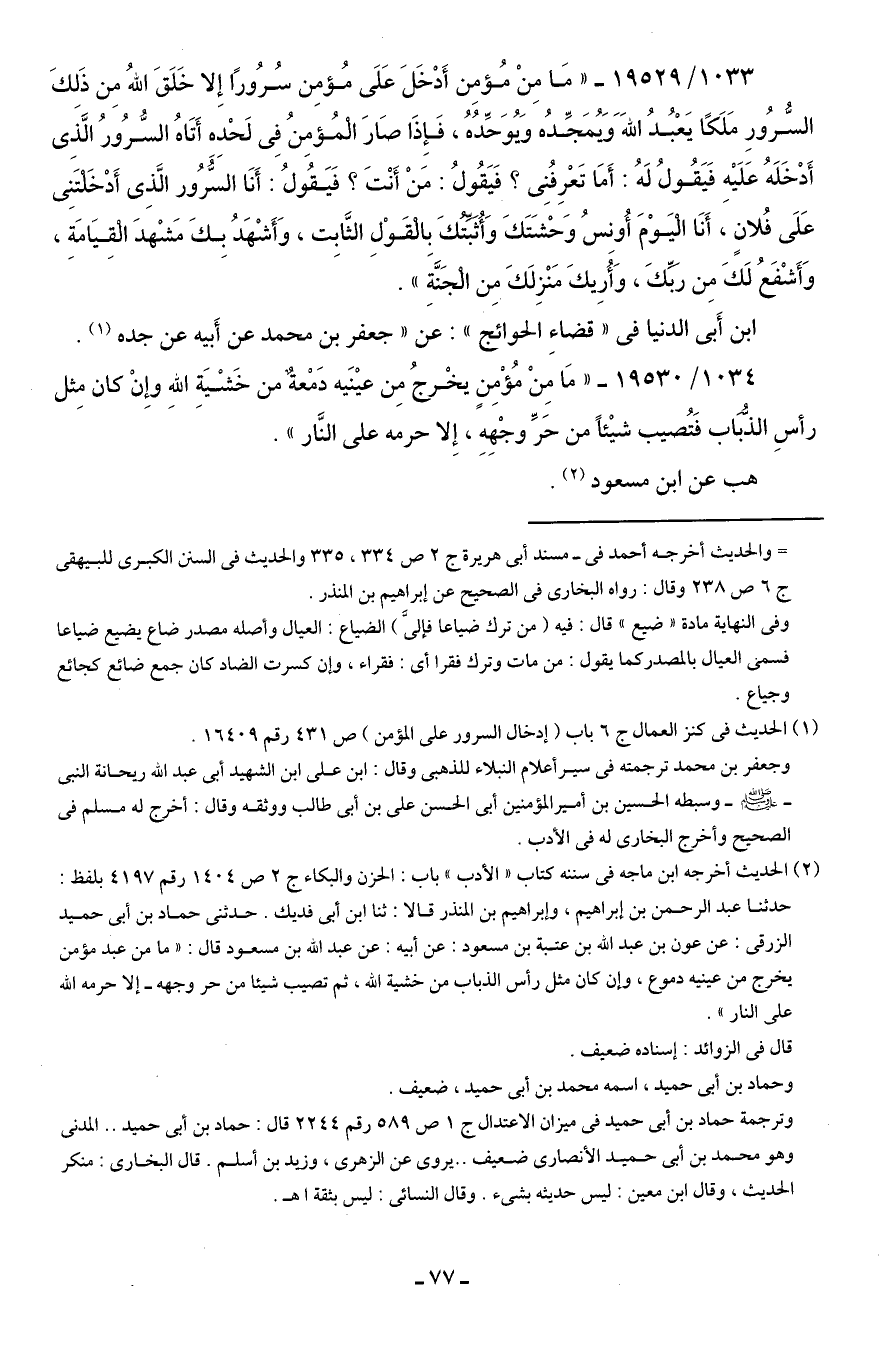 1033/ 19529 - "مَا مِنْ مُؤمِنٍ أَدْخَلَ عَلَى مُؤمِن سُرُورًا إِلا خَلَقَ اللهُ مِن ذَلِكَ السُّرُورِ مَلَكًا يَعْبُدُ اللهَ ويُمَجِّدُه وَيُوَحِّدُهُ، فَإِذَا صَارَ المُؤمِنُ فِي لَحْدِه أَتَاهُ السُّرُورُ الَّذي أَدْخَلَهُ عَلَيهِ فَيَقُولُ لَهُ: أَمَا تَعْرِفُنِى؟ فَيَقُولُ: مَنْ أَنْتَ؟ فَيَقُولُ: أَنَا السُّرُور الَّذِي أَدْخَلتَنَى عَلَى فُلانٍ، أَنَا اليَوْمَ أُونِسُ وَحْشَتَكَ وَأُثبِّتكَ بالقَوْلِ الثَّابِت، وَأَشْهَدُ بِكَ مَشْهدَ القِيَامَةِ، وَأَشْفَعُ لَك مِن ربِّكَ، وَأُرِيكَ مَنْزِلَكَ مِن الجَنَّةِ".