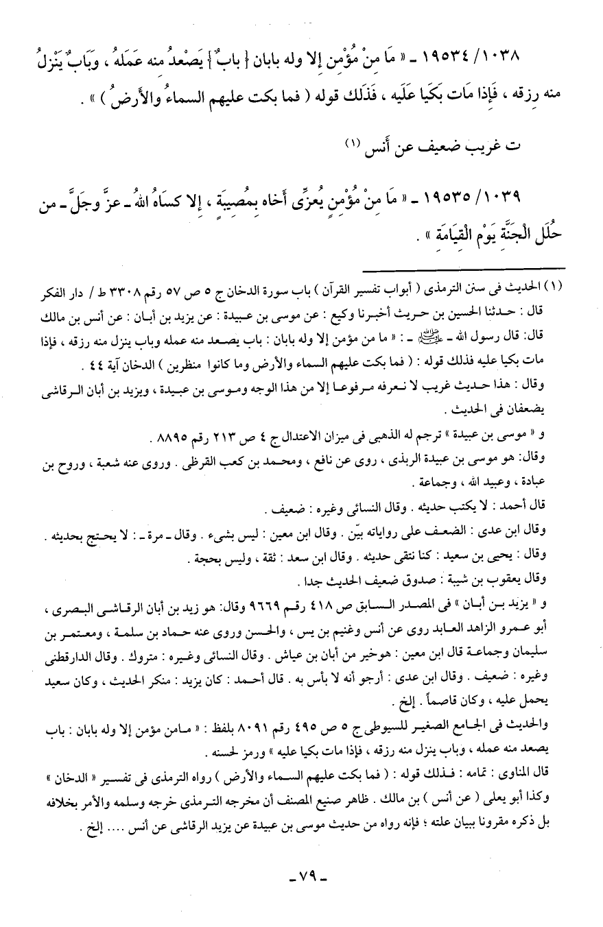 (¬1) الحديث في سنن الترمذي (أبواب تفسير القرآن) باب سورة الدخان ج 5 ص 57 رقم 3308 ط / دار الفكر قال: حدثنا الحسين بن حريث أخبرنا وكيع: عن موسى بن عبيدة: عن يزيد بن أبان: عن أنس بن مالك قال: قال رسول الله - صلى الله عليه وسلم -: "ما من مؤمن إلا وله بابان: باب يصعد منه عمله وباب ينزل منه رزقه، فإذا مات بكيا عليه فذلك قوله: {فَمَا بَكَتْ عَلَيهِمُ السَّمَاءُ وَالْأَرْضُ وَمَا كَانُوا مُنْظَرِينَ} [الدخان: 29].