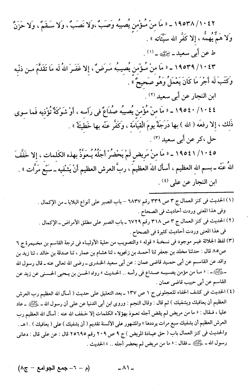 1042/ 19538 - "مَا مِنْ مُؤْمِنٍ يُصيبُه وَصَبٌ، وَلا نَصَبٌ، وَلا سَقَمٌ، وَلا حَزَنٌ وَلا هَمٌّ يُهمُّه، إِلا كَفَّر الله سيِّئاته".