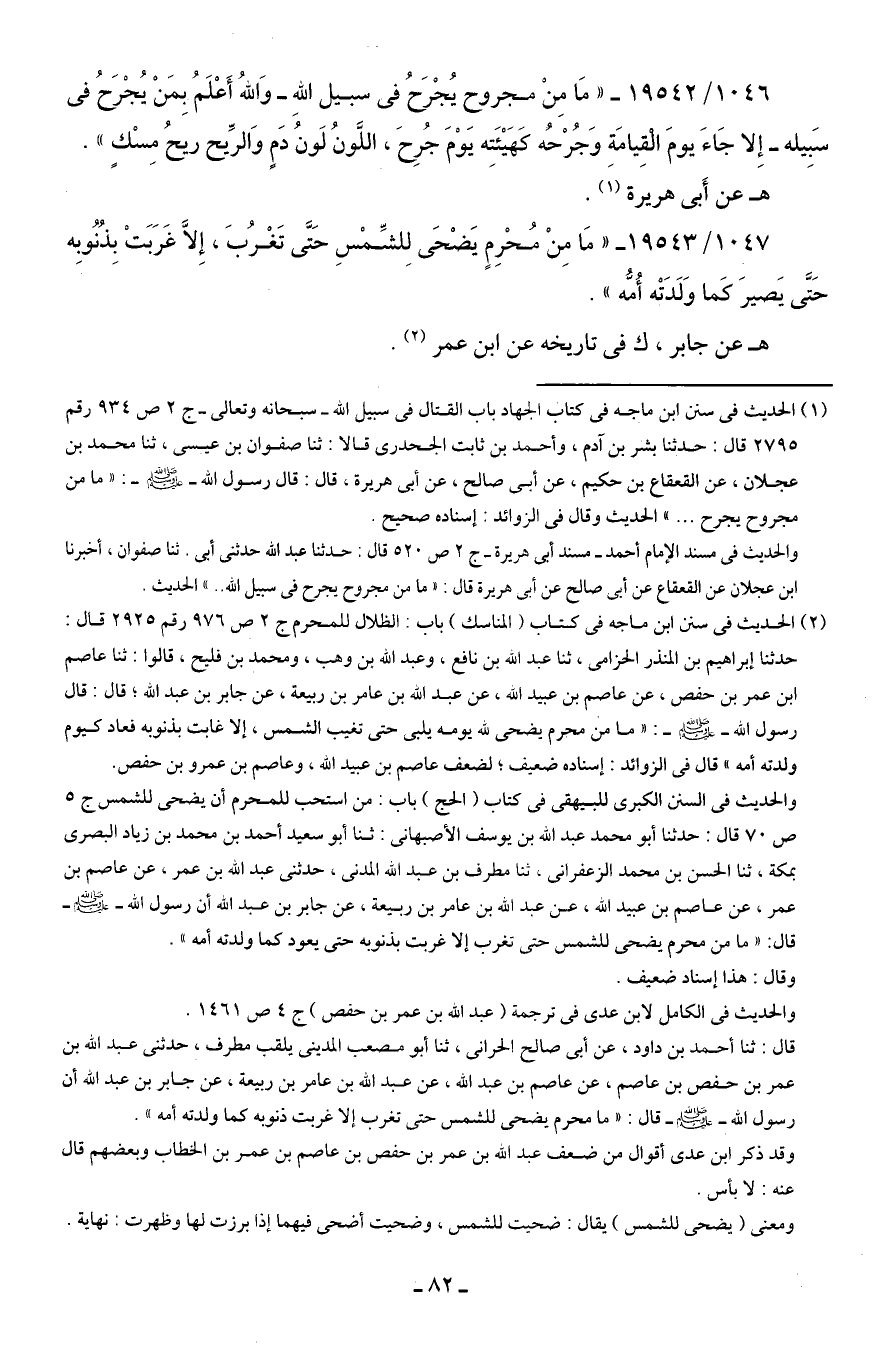 1046/ 19542 - "مَا مِنْ مجروح يُجْرَحُ في سبيل اللهِ -وَاللهُ أَعْلَمُ بِمَنْ يُجْرَحُ في سَبِيله- إِلا جَاءَ يومَ القِيامَةِ وَجُرْحُه كَهَيئَتِه يَوْمَ جُرِحَ، اللَّونُ لَونُ دَمٍ وَالرِّيح ريحُ مِسْكٍ".