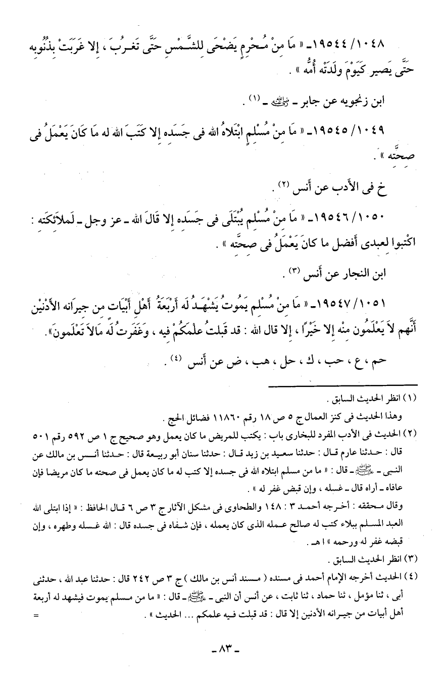 1050/ 19546 - "مَا مِنْ مُسْلِمٍ يُبْتَلَى في جَسَدِه إِلا قَال الله -عزَّ وجلَّ- لَملائِكَتهِ: اكْتبوا لِعبدى أَفضل ما كانَ يَعْمَلُ في صِحَّتِه".
