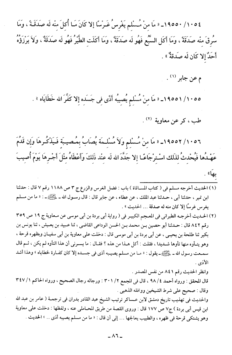 1055/ 19551 - "مَا مِنْ مُسْلِمٍ يُصِيبُه أَذًى فِي جَسَدِه إِلا كفَّرَ الله خَطَايَاه".