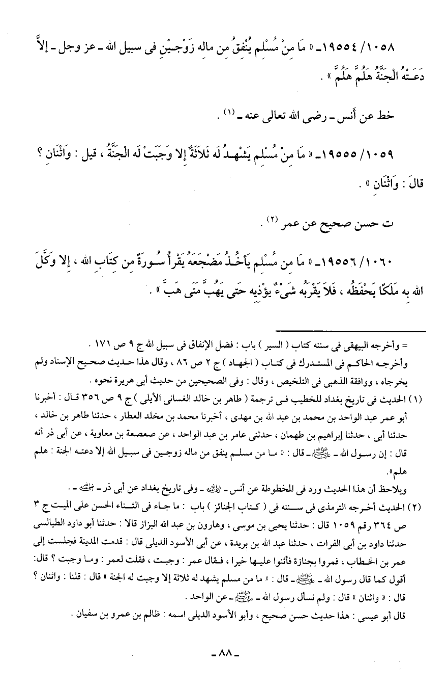 1059/ 19555 - "مَا مِنْ مُسْلِم يَشْهدُ لَه ثَلاثَةٌ إِلا وَجَبَتْ لَه الجَنَّةُ، قيل: وَاثْنَانِ؟ قال: وَاثْنَانِ".