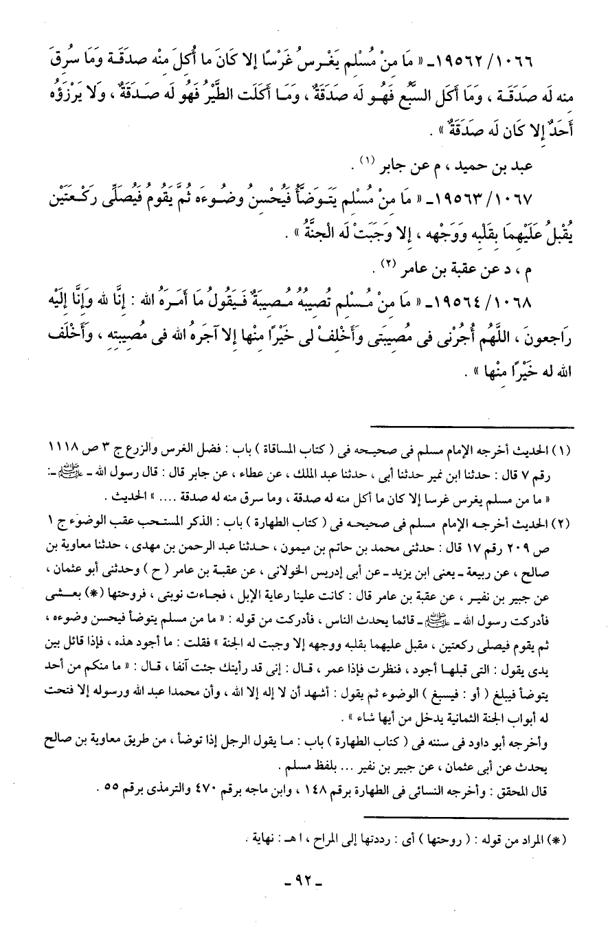 1067/ 19563 - "مَا مِنْ مُسْلِمٍ يَتَوَضّأ فَيُحْسِنُ وضُوءَه ثُمَّ يَقُومُ فَيُصَلِّى رَكْعَتَين يُقْبلُ عَلَيهِمَا بِقَلبِه وَوَجْهه، إِلا وَجَبَتْ لَه الجنَّةُ".
