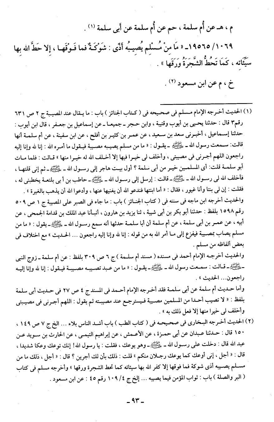 (¬1) الحديث أخرجه الإمام مسلم في صحيحه في (كتاب الجنائز) باب: ما يقال عند المصيبة ج 2 ص 631 رقم 3 قال: حدثنا يحيى بن أيوب وقتيبة، وابن حجر -جميعا- عن إسماعيل بن جعفر، قال ابن أيوب: حدثنا إسماعيل، أخبرني سعد بن سعيد، عن عمر بن كثير بن أفلح، عن ابن سفينة، عن أم سلمة أنها قالت: سمعت رسول الله - صلى الله عليه وسلم - يقول: "ما من مسلم يصيبه مصيبة فيقول ما أمره الله: إنا لله وإنا إليه راجعون اللهم أجرنى في مصيبتى، وأخلف لي خيرا فيها إلا أخلف الله له خيرا منها" قالت: فلما مات أبو سلمة قلت: أي المسلمين خير من أبي سلمة؟ أول بيت هاجر إلى رسول الله - صلى الله عليه وسلم - ثم إني قلتها، فأخلف الله لي رسول الله - صلى الله عليه وسلم - قالت: أرسل إلى رسول الله - صلى الله عليه وسلم - حاطب بن أبي بلتعة يخطبنى له، فقلت: إن لي بنتا وأنا غيور، فقال: "أما ابنتها فتدعو الله أن يغنيها عنها، وأدعوا الله أن يذهب بالغيرة".