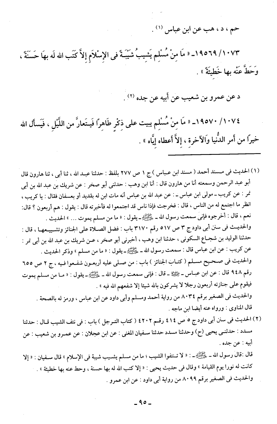 1073/ 19569 - "مَا مِنْ مُسْلِم يَشِيبُ شَيبَةً في الإِسْلامِ إِلَّا كتَب الله لَه بهَا حَسَنَةً، وَحَطَّ عَنْه بها خَطيئَةً".