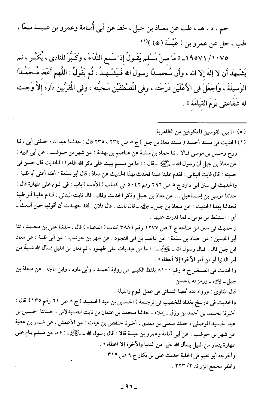 1075/ 19571 - "مَا مِنْ مُسْلِم يَقُولُ إِذا سَمِع النِّدَاءَ، وَكَبَّرَ المنادى، يُكبِّر، ثم يَشْهَد أَن لا إِلهَ إِلا الله، وأَن مُحمدًا رسولُ الله فَيَشْهدُ، ثُم يَقُولُ: اللَّهم أَعْطِ مُحَمَّدًا الوَسِيلَةَ، وَاجْعَلْ في الأَعلَين دَرَجَته، وفِى المُصْطفَين مَحبَّته، وفِى المُقرِّبين دَارَه إِلَّا وَجبت له شَفَاعتى يَوْمَ القِيَامَةِ".