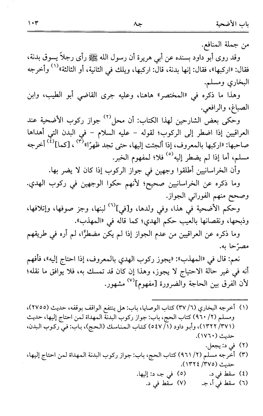 وحكى بعض الشارحين لهذا الكتاب: أن محل جواز ركوب الأضحية عند العراقيين إذا اضطر إلى الركوب؛ لقوله- عليه السلام- في البدن التي أهداها صاحبها: "اركبها بالمعروف، إذا ألجئت إليها، حتى تجد ظهراً"، [كما] أخرجه مسلم، أما إذا لم يضطر إليه فلا؛ لمفهوم الخبر.