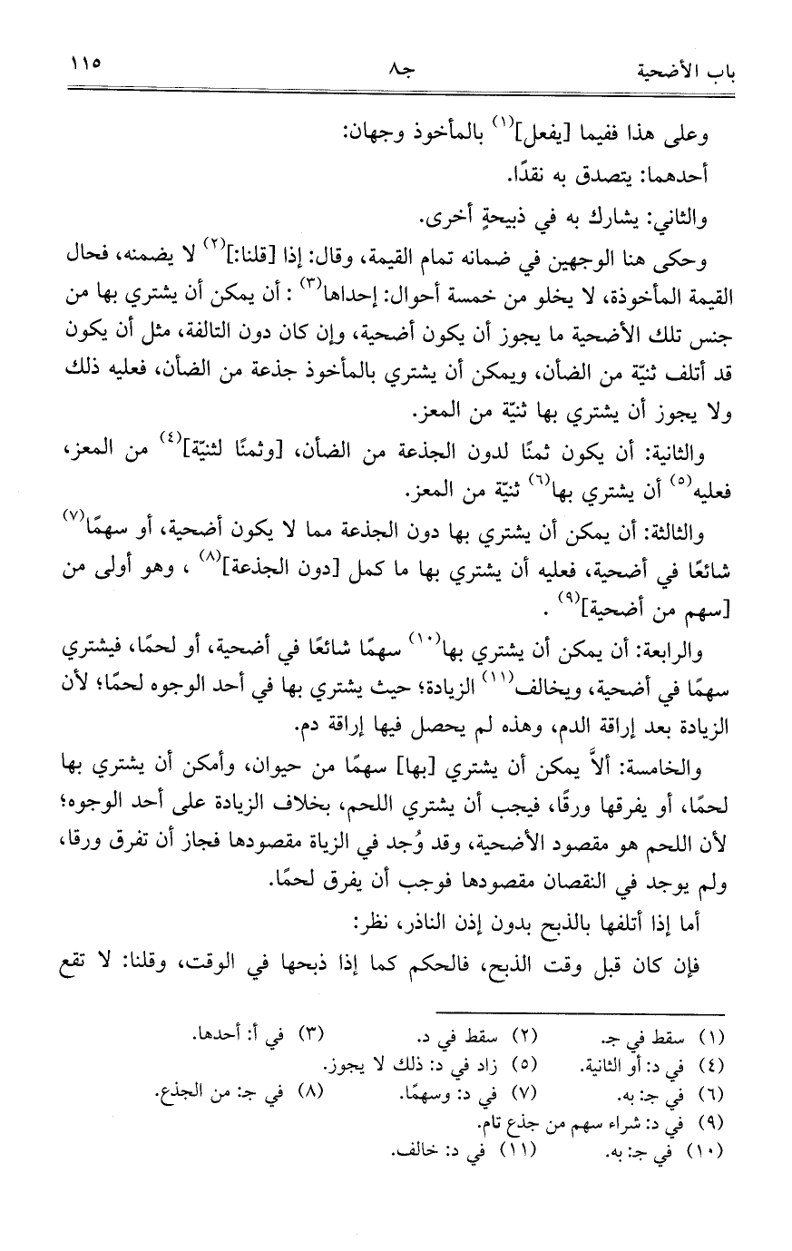 والخامسة: ألا يمكن أن يشتري [بها] سهماً من حيوان، وأمكن أن يشتري بها لحماً، أو يفرقها ورقاً، فيجب أن يشتري اللحم، بخلاف الزيادة على أحد الوجوه؛ لأن اللحم هو مقصود الأضحية، وقد وجد في الزيادة مقصودها فجاز أن تفرق ورقاً، ولم يوجد في النقصان مقصودها فوجب أن يفرق لحماً.