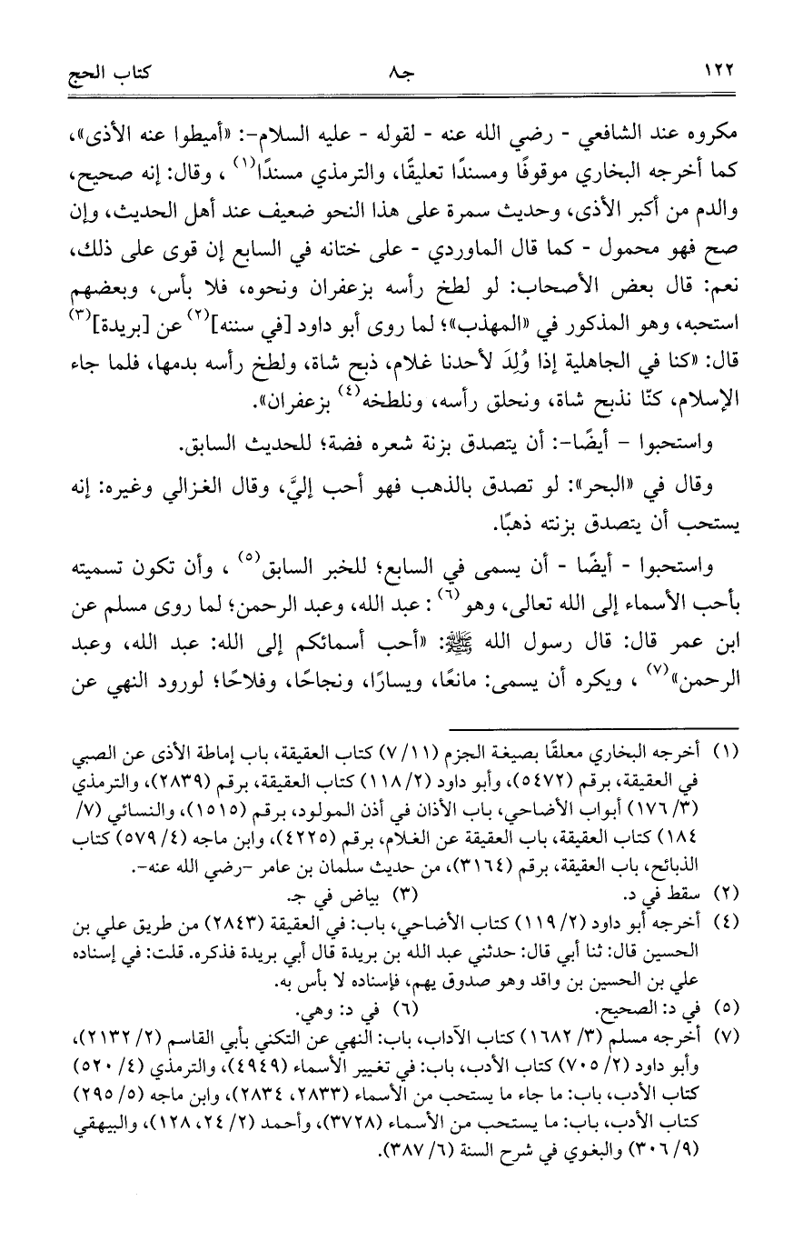 واستحبوا- أيضاً- أن يسمى في السابع؛ للخبر السابق، وأن تكون تسميته بأحب الأسماء إلى الله تعالى، وهو: عبد الله، وعبد الرحمن؛ لما روى مسلم عن ابن عمر قال: قال رسول الله - صلى الله عليه وسلم -: "أحب أسمائكم إلى الله: عبد الله، وعبد الرحمن"، ويكره أن يسمى: مانعاً، ويساراً، ونجاحاً، وفلاحاً؛ لورود النهي عن