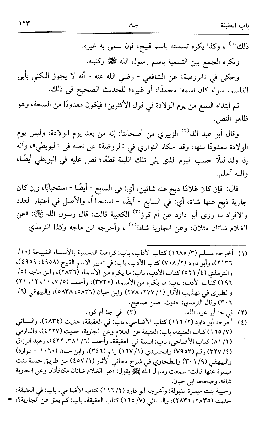 قال: فإن كان غلاماً ذبح عنه شاتين، أي: في السابع- أيضاً- استحباباً، وإن كان جارية ذبح عنها شاة، أي: في السابع – أيضاً- استحباباً، والأصل في اعتبار العدد والإفراد ما روى أبو داود عن أم كرز الكعبية قالت: قال رسول الله - صلى الله عليه وسلم -: "عن الغلام شاتان مثلان، وعن الجارية شاة"، وأخرجه ابن ماجه وكذا الترمذي.