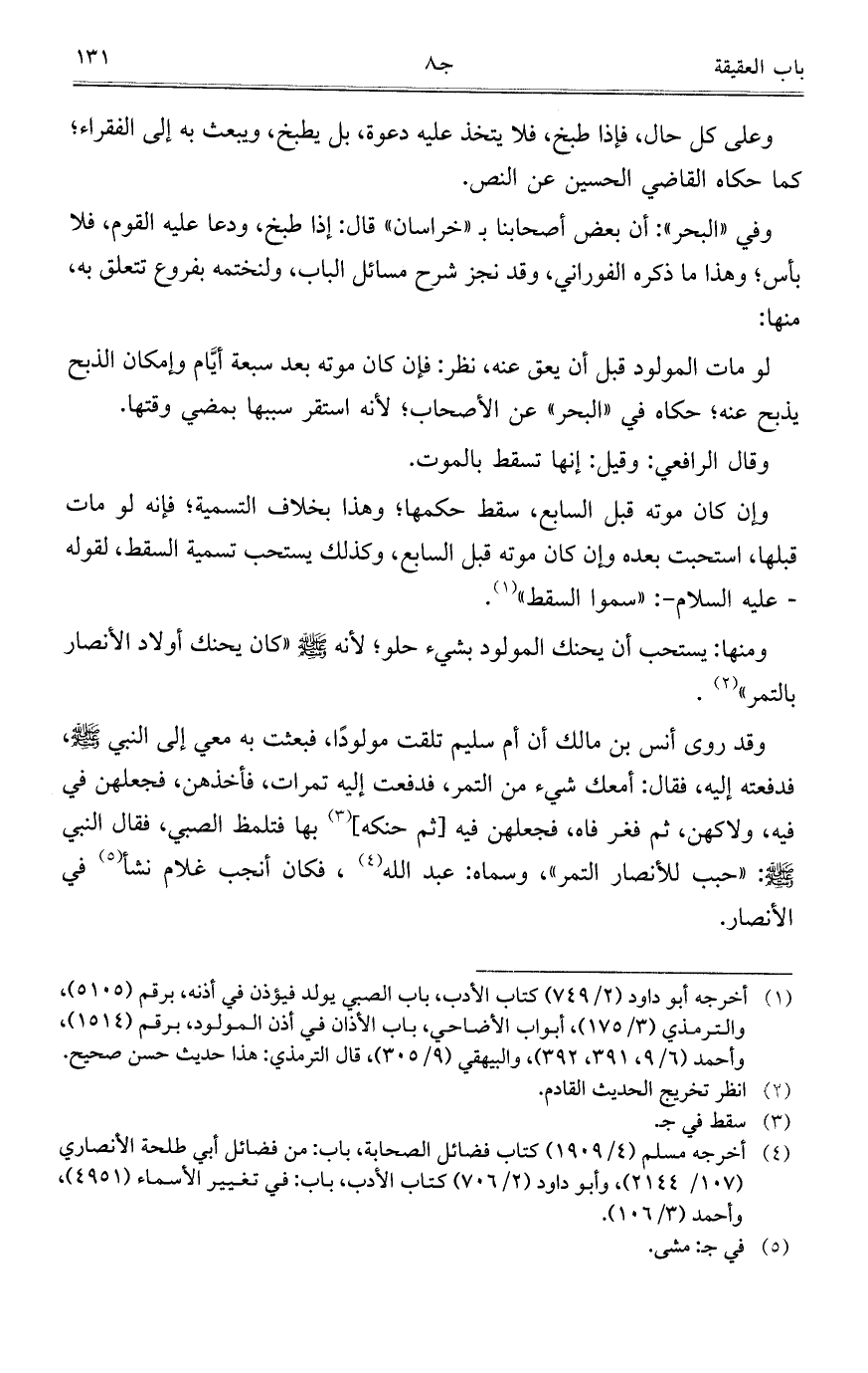 ومنها: يستحب أن يحنك المولود بشيء حلو؛ لأنه - صلى الله عليه وسلم - "كان يحنك أولاد الأنصار بالتمر".