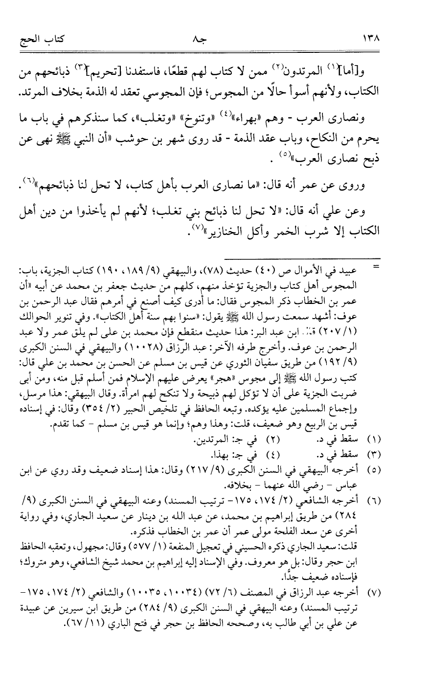 ونصارى العرب- وهم "بهراء" "وتنوخ" "وتغلب"، كما سنذكرهم في باب ما يحرم من النكاح، وباب عقد الذمة- قد روى شهر بن حوشب "أن النبي - صلى الله عليه وسلم - نهى عن ذبح نصارى العرب".