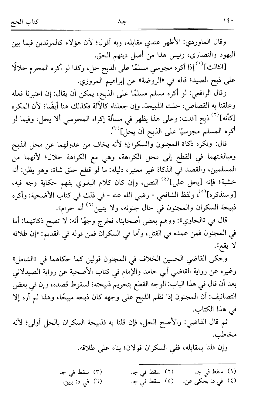 قال: وتكره ذكاة المجنون والسكران؛ لأنه يخاف من عدولهما عن محل الذبح ومبالغتهما في القطع إلى محل الكراهة، وهي مع الكراهة حلال؛ لأنهما من المسلمين، والقصد في الزكاة غير معتبر، دليله: ما لو قطع حلق شاة، وهو يظن: أنه خشبة؛ فإنه [يحل على] النص، وإن كان كلام البغوي يفهم حكاية وجه فيه، [وسنذكره]، ولفظ الشافعي- رضي الله عنه- في ذلك في كتاب الأضحية: وأكره ذبيحة السكران والمجنون في حال جنونه، ولا يتبين أنه حرام".