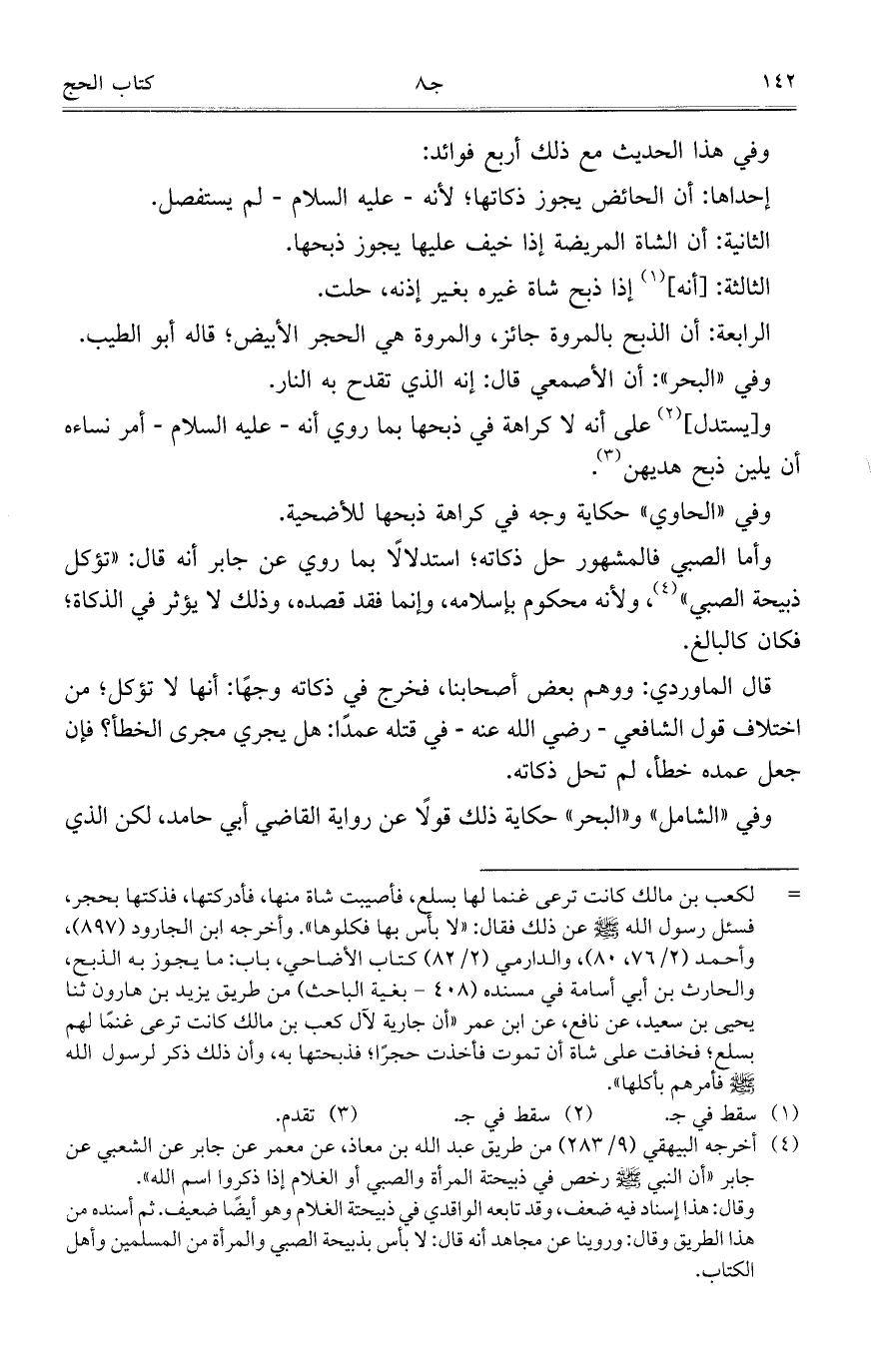 إحداها: أن الحائض يجوز ذكاتها؛ لأنه- عليه السلام- لم يستفصل.