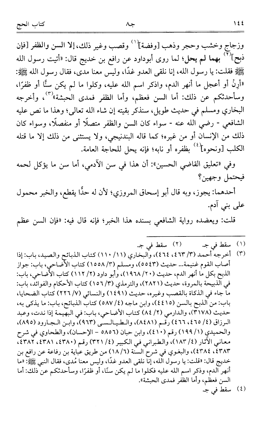 وزجاج وخشب وحجر وذهب [وفضة] وقصب وغير ذلك، إلا السن والظفر [فإن ذبح] بهما لم يحل؛ لما روى أبو داود عن رافع بن خديج قال: "أتيت رسول الله - صلى الله عليه وسلم - فقلت: يا رسول الله، إنا نلقى العدو غداً، وليس معنا مدى، فقال رسول الله - صلى الله عليه وسلم -: "أرن أو أعجل ما أنهر الدم، واذكر اسم الله عليه، وكلوا ما لم يكن سناً أو ظفراً، وسأحدثكم عن ذلك: أما السن فعظم، وأما الظفر فمدى الحبشة"، وأخرجه البخاري ومسلم في حديث طويل، سنذكر بقيته إن شاء الله تعالى؛ وهذا ما نص عليه الشافعي- رضي الله عنه- سواء كان السن والظفر متصلاً أو منفصلاً، وسواء كان ذلك من الإنسان أو من غيره؛ كما قاله البندنيجي، ولا يستثنى من ذلك إلا ما قتله الكلب [ونحوه] بظفره أو نابه؛ فإنه يحل للحاجة العامة.