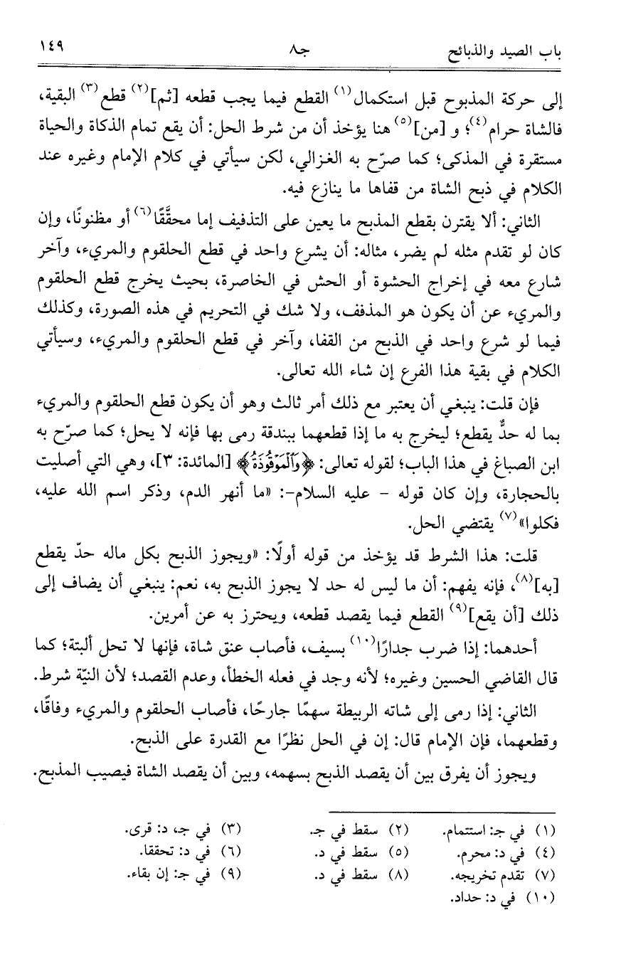 إلى حركة المذبوح قبل استكمال القطع فيما يجب قطعه [ثم] قطع البقية، فالشاة حرام؛ و [من] هنا يؤخذ أن من شرط الحل: أن يقع تمام الذكاة والحياة مستقرة في المذكى؛ كما صرح به الغزالي، لكن سيأتي في كلام الإمام وغيره عند الكلام في ذبح الشاة من قفاها ما ينازع فيه.
