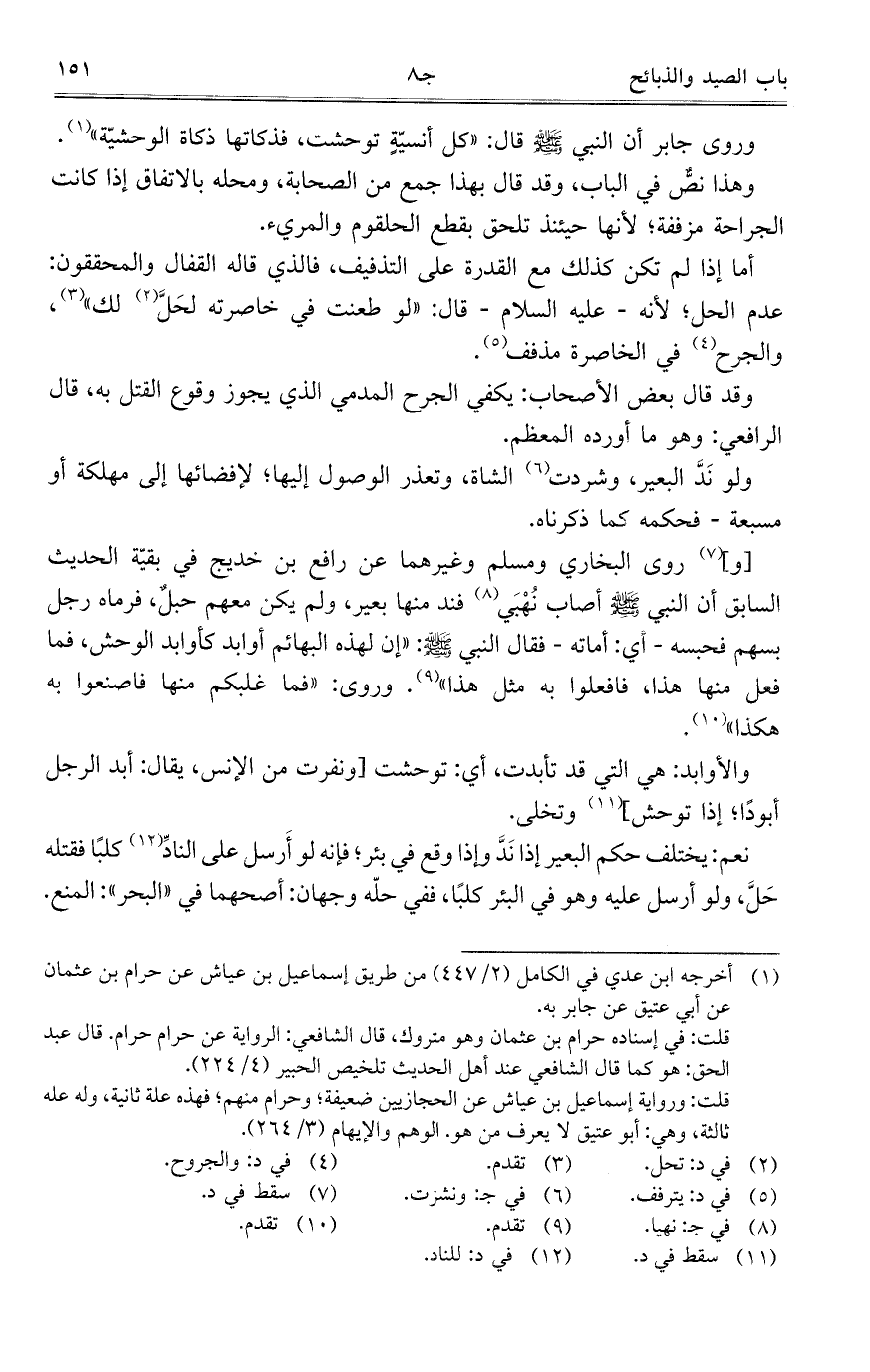 [و] روى البخاري ومسلم وغيرهما عن رافع بن خديج في بقية الحديث السابق أن النبي - صلى الله عليه وسلم - أصاب نهبي فند منها بعير، ولم يكن معهم حبل، فرماه رجل بسهم فحبسه- أي: أماته- فقال النبي - صلى الله عليه وسلم -: "إن لهذه البهائم أوابد كأوابد الوحش، فما فعل منها هذا، فافعلوا به مثل هذا". وروى: "فما غلبكم منها فاصنعوا به هكذا".