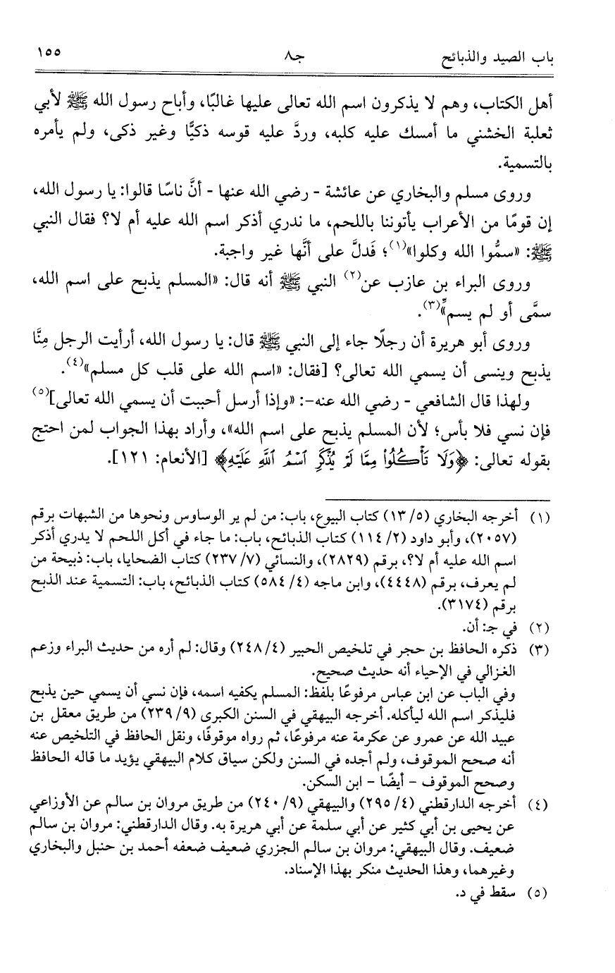 أهل الكتاب، وهم لا يذكرون اسم الله تعالى عليها غالباً، وأباح رسول الله - صلى الله عليه وسلم - لأبي ثعلبة الخشني ما أمسك عليه كلبه، وردَّ عليه قوسه ذكياً وغير ذكي، ولم يأمره بالتسمية.