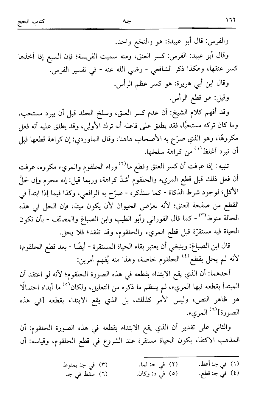 تنبيه: إذا عرفت أن كسر العنق وقطع ما وراء الحلقوم والمريء مكروه، عرفت أن فعل ذلك قبل قطع المريء والحلقوم أشد كراهة، وربما قيل: إنه محرم وإن حل الأكل؛ لوجود شرط الذكاة- كما سنذكره- صرح به الرافعي، وكذا فيما إذا ابتدأ في القطع من صفحة العنق؛ لأنه يعرض الحيوان لأن يكون ميتة، فإن الحل في هذه الحالة منوط- كما قال الفوراني وأبو الطيب وابن الصباغ والمصنف- بأن تكون الحياة فيه مستقرة قبل قطع المريء والحلقوم، وقد تفقد؛ فلا يحل.