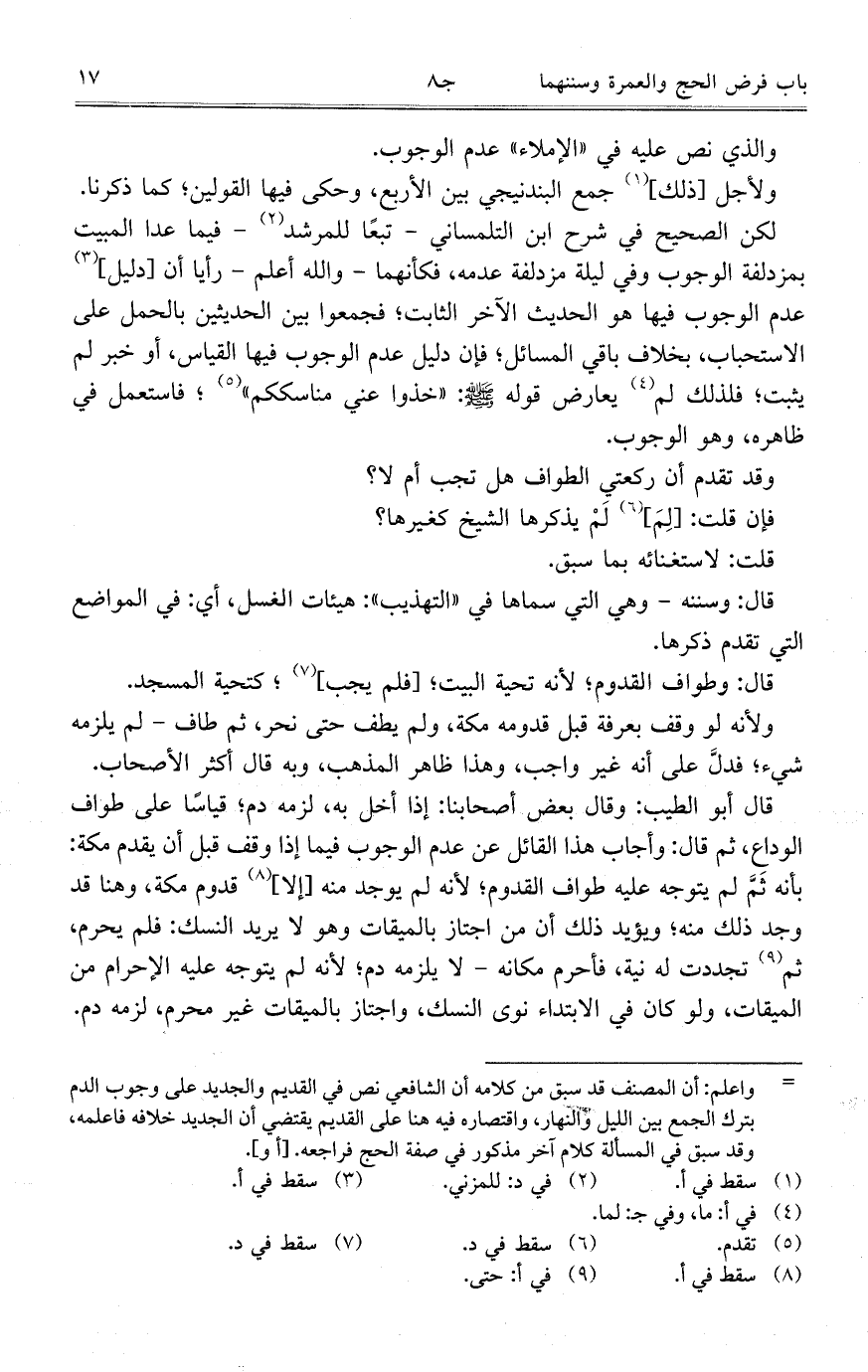 لكن الصحيح في شرح ابن التلمساني- تبعاً للمرشد- فيما عدا المبيت بمزدلفة الوجوب وفي ليلة مزدلفة عدمه، فكأنهما- والله أعلم- رأيا أن [دليل] عدم الوجوب فيها هو الحديث الآخر الثابت؛ فجمعوا بين الحديثين بالحمل على الاستحباب، بخلاف باقي المسائل؛ فإن دليل عدم الوجوب فيها القياس، أو خبر لم يثبت؛ فلذلك لم يعارض قوله - صلى الله عليه وسلم -: "خذوا عني مناسككم"؛ فاستعمل في ظاهره، وهو الوجوب.