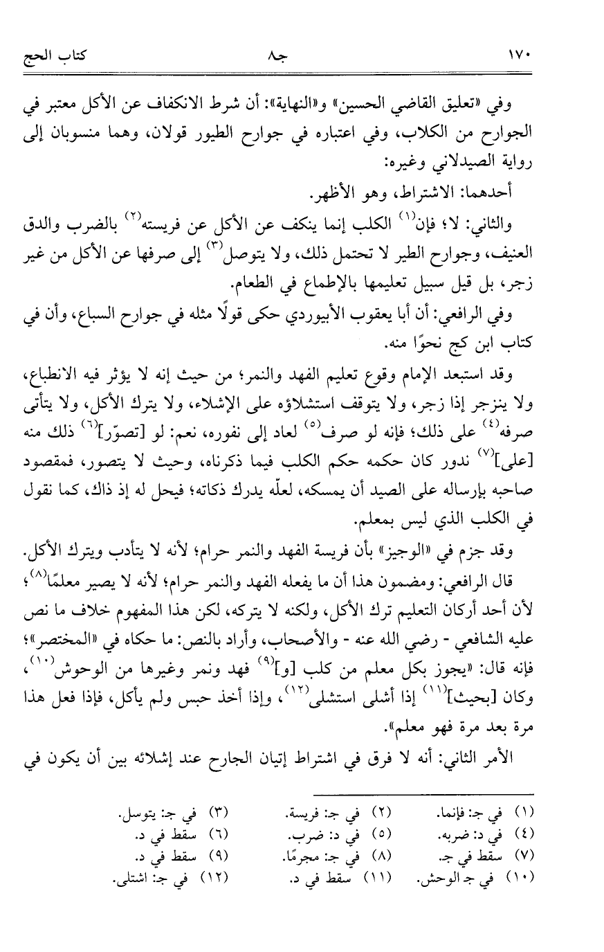 وفي "تعليق القاضي الحسين" و"النهاية": أن شرط الانكفاف عن الأكل معتبر في الجوارح من الكلاب، وفي اعتباره في جوارح الطيور قولان، وهما منسوبان إلى رواية الصيدلاني وغيره: