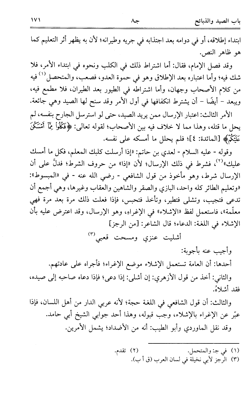 وقوله- عليه السلام- لعدي بن حاتم: "إذا أرسلت كلبك المعلم، فكل ما أمسك عليك"، فشرط في ذلك الإرسال؛ لأن "إذا" من حروف الشرط؛ فدلَّ على أن الإرسال شرط، وهو مأخوذ من قول الشافعي- رضي الله عنه- في "المبسوط": "وتعليم الطائر كله واحد، البازي والصقر والشاهين والعقاب وغيرها، وهي أجمع أن تدعى فتجيب، وتشلى فتطير، وتأخذ فتحبس، فإذا فعلت ذلك مرة بعد مرة فهي معلمة"، فاستعمل لفظ "الإشلاء" في الإغراء، وهو الإرسال، وقد اعترض عليه بأن الإشلاء في اللغة: الدعاء؛ قال الشاعر: [من الرجز].