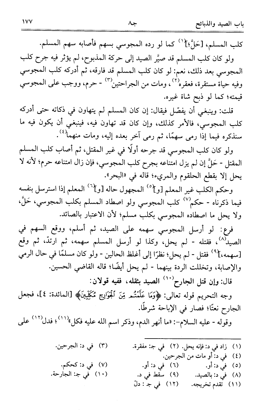 ولو كان كلب المجوسي قد جرحه أولاً في غير المقتل، ثم أصاب كلب المسلم المقتل- حلَّ إن لم يزل امتناعه بجرح كلب المجوسي، فإن زال امتناعه حرم؛ لأنه لا يحل إلا بقطع الحلقوم والمريء؛ قاله في "البحر".