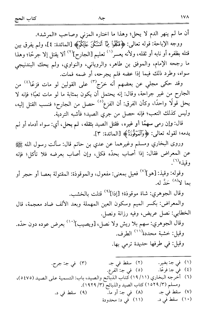 وروى البخاري ومسلم وغيرهما عن عدي بن حاتم قال: سألت رسول الله - صلى الله عليه وسلم - عن المعراض فقال: إذا أصاب بحده فكل، وإن أصاب بعرضه فلا تأكل؛ فإنه وقيذ".