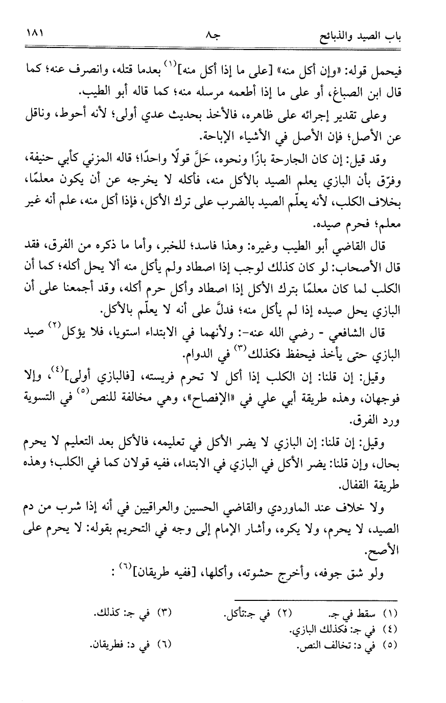 وقد قيل: إن كان الجارحة بازاً ونحوه، حل قولاً واحداً؛ قاله المزني كأبي حنيفة، وفرق بأن البازي يعلم الصيد بالأكل منه، فأكله لا يخرجه عن أن يكون معلماً، بخلاف الكلب، لأنه يعلم الصيد بالضرب على ترك الأكل، فإذا أكل منه، علم أنه غير معلم؛ فحرم صيده.