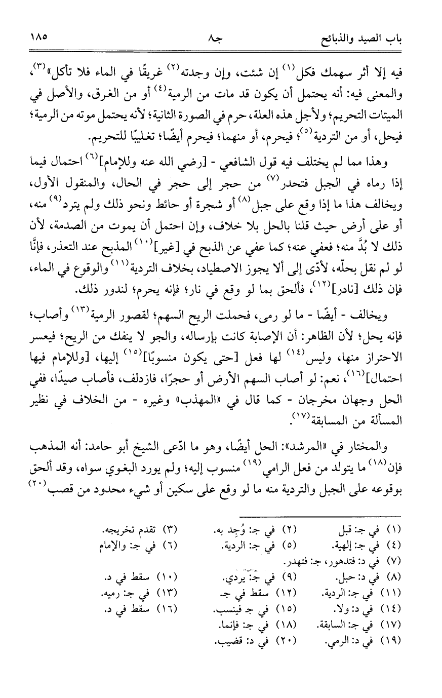 فيه إلا أثر سهمك فكل إن شئت، وإن وجدته غريقاً في الماء فلا تأكل"، والمعنى فيه: أنه يحتمل أن يكون قد مات من الرمية أو من الغرق، والأصل في الميتات التحريم؛ ولأجل هذه العلة، حرم في الصورة الثانية؛ لأنه يحتمل موته من الرمية؛ فيحل، أو من التردية؛ فيحرم، أو منهما، فيحرم أيضاً؛ تغليباً للتحريم.