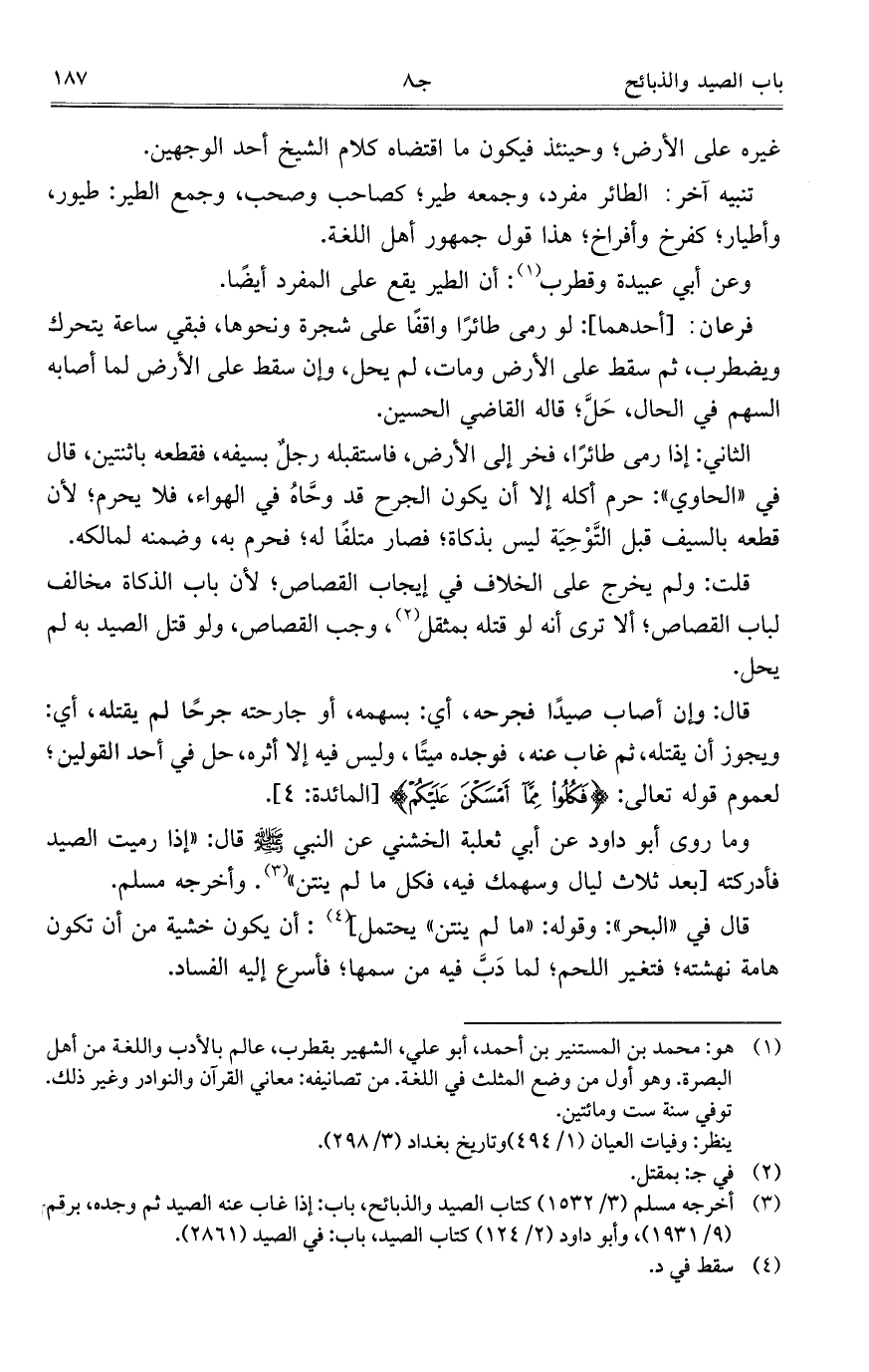تنبيه آخر: الطائر مفرد، وجمعه طير؛ كصاحب وصحب، وجمع الطير: طيور، وأطيار؛ كفرخ وأفراخ؛ هذا قول جمهور أهل اللغة.