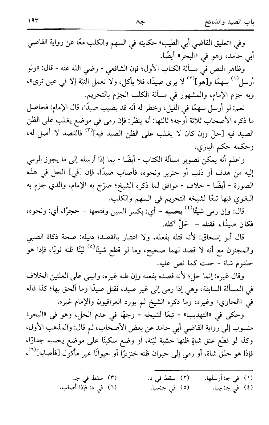 وفي "تعليق القاضي أبي الطيب" حكايته في السهم والكلب معاً عن رواية القاضي أبي حامد، وهو في "البحر" أيضاً.