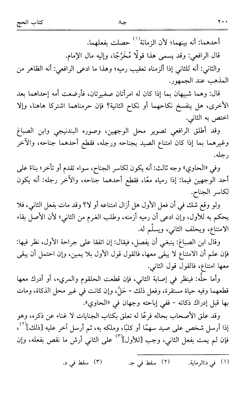 وقد أطلق الرافعي تصوير محل الوجهين، وصوره البندنيجي وابن الصباغ وغيرهما بما إذا كان امتناع الصيد بجناحه ورجله، فقطع أحدهما جناحه، والآخر رجله.