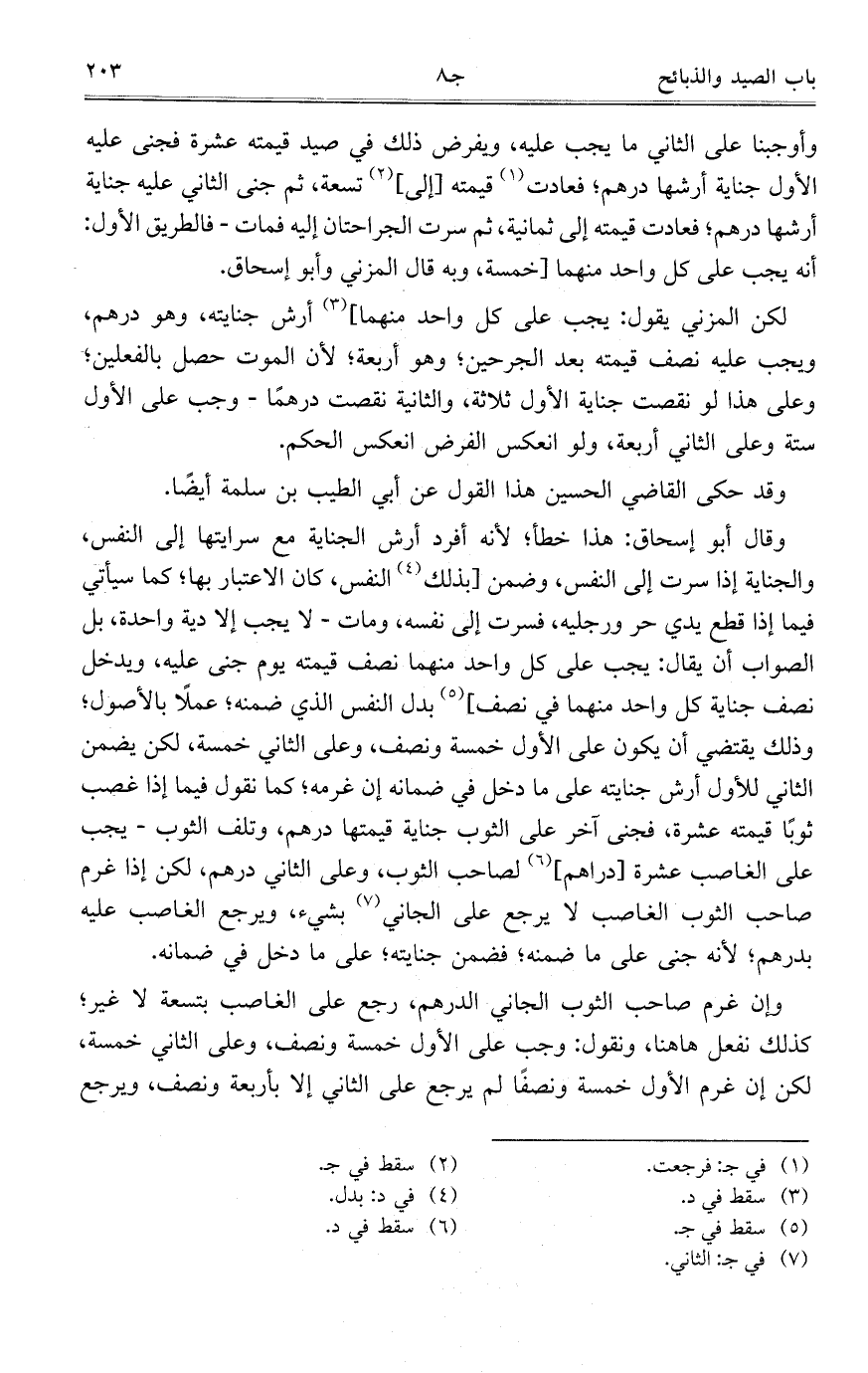 وقال أبو إسحاق: هذا خطأ؛ لأنه أفرد أرش الجناية مع سرايتها إلى النفس، والجناية إذا سرت إلى النفس، وضمن [بذلك النفس، كان الاعتبار بها؛ كما سيأتي فيما إذا قطع يدي حر ورجليه، فسرت إلى نفسه، ومات- لا يجب إلا دية واحدة، بل الصواب أن يقال: يجب على كل واحد منهما نصف قيمته يوم جنى عليه، ويدخل نصف جناية كل واحد منهما في نصف] بدل النفس الذي ضمنه؛ عملاً بالأصول؛ وذلك يقتضي أن يكون على الأول خمسة ونصف، وعلى الثاني خمسة، لكن يضمن الثاني للأول أرش جنايته على ما دخل في ضمانه إن غرمه؛ كما نقول فيما إذا غصب ثوباً قيمته عشرة، فجنى آخر على الثوب جناية قيمتها درهم، وتلف الثوب- يجب على الغاصب عشرة [دراهم] لصاحب الثوب، وعلى الثاني درهم، لكن إذا غرم صاحب الثوب الغاصب لا يرجع على الجاني بشيء، ويرجع الغاصب عليه بدرهم؛ لأنه جنى على ما ضمنه؛ فضمن جنايته؛ على ما دخل في ضمانه.