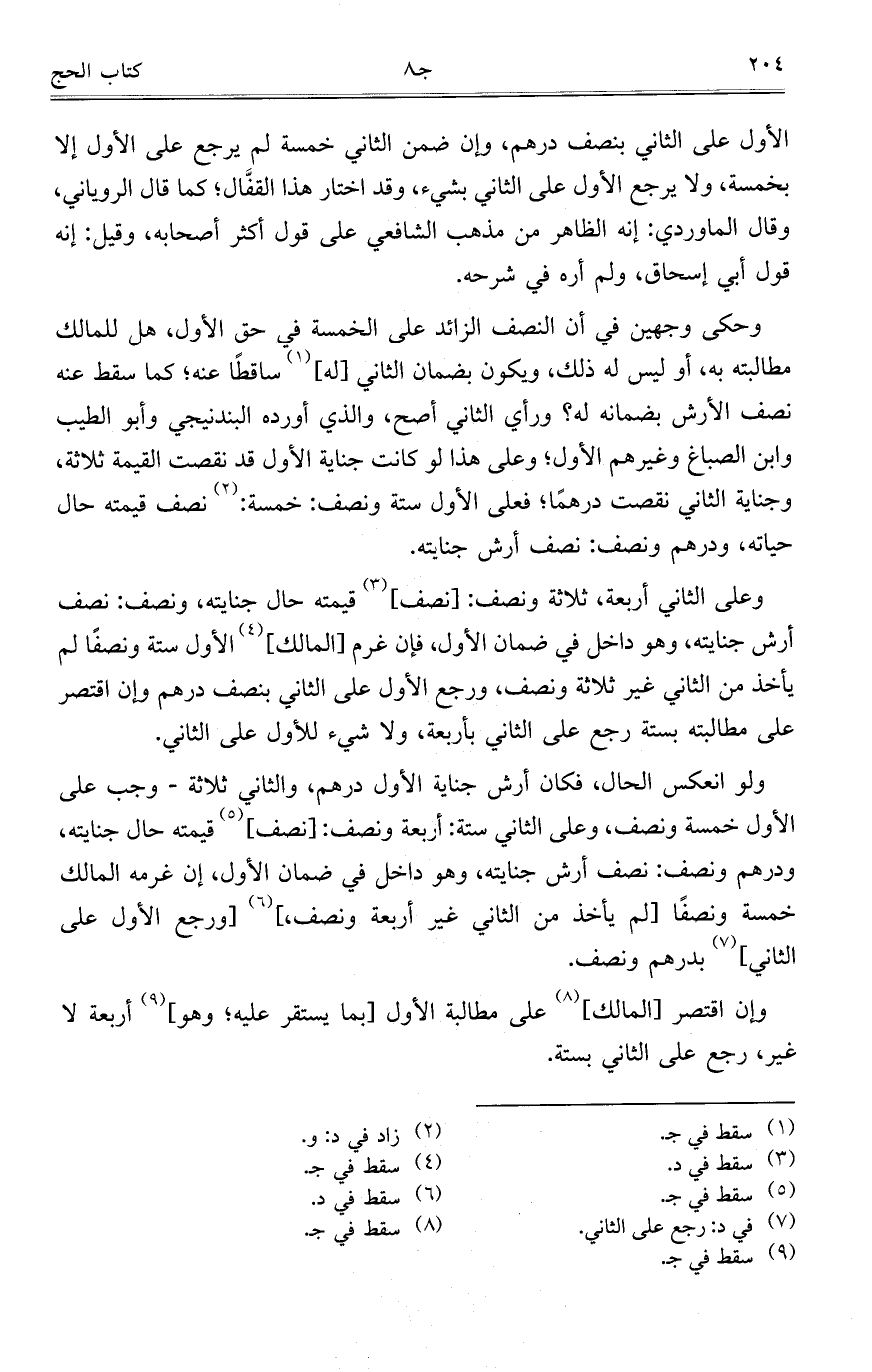وعلى الثاني أربعة، ثلاثة ونصف: [نصف] قيمته حال جنايته، ونصف: نصف أرش جنايته، وهو داخل في ضمان الأول، فإن غرم [المالك] الأول ستة ونصفاً لم يأخذ من الثاني غير ثلاثة ونصف، ورجع الأول على الثاني بنصف درهم وإن اقتصر على مطالبته بستة رجع على الثاني بأربعة، ولا شيء للأول على الثاني.
