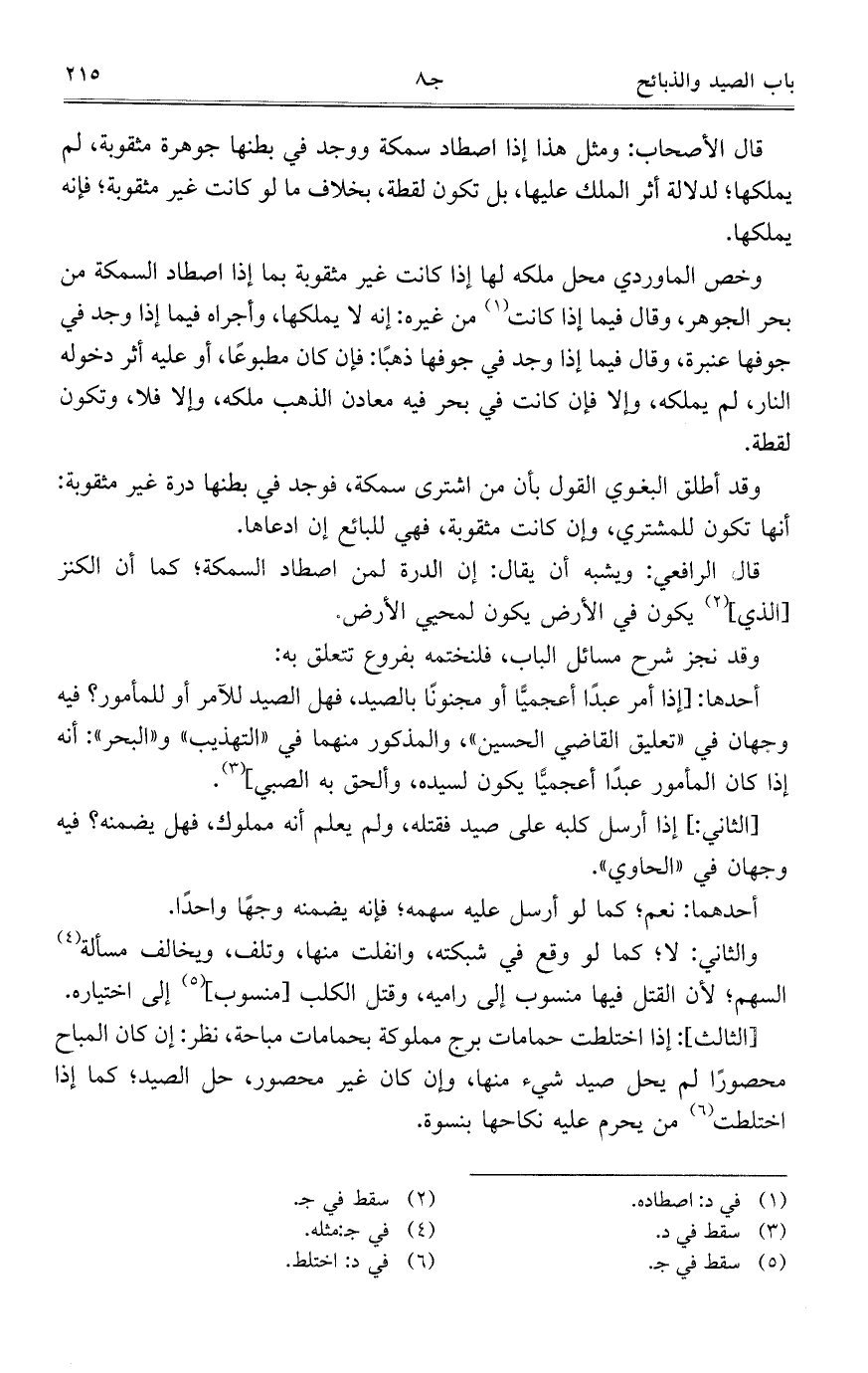 قال الأصحاب: ومثل هذا إذا اصطاد سمكة ووجد في بطنها جوهرة مثقوبة، لم يملكها؛ لدلالة أثر الملك عليها، بل تكون لقطة، بخلاف ما لو كانت غير مثقوبة؛ فإنه يملكها.
