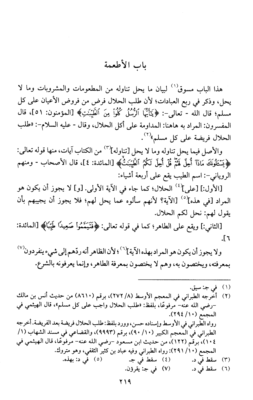 هذا الباب مسوق لبيان ما يحل تناوله من المطعومات والمشروبات وما لا يحل، وذكر في ربع العبادات؛ لأن طلب الحلال فرض من فروض الأعيان على كل مسلم؛ قال الله - تعالى-: {يَا أَيُّهَا الرُّسُلُ كُلُوا مِنْ الطَّيِّبَاتِ} [المؤمنون: 51]، قال المفسرون: المراد به هاهنا: المداومة على أكل الحلال، وقال- عليه السلام-: "طلب الحلال فريضة على كل مسلم".